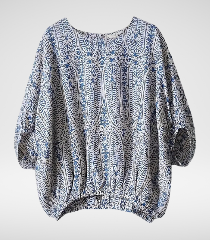 Soft to the touch and built for movement, this vintage-patterned blouse balances freedom with form. A back ribbon accent cinches the waist gently, making it an easy favorite for everyday layering.