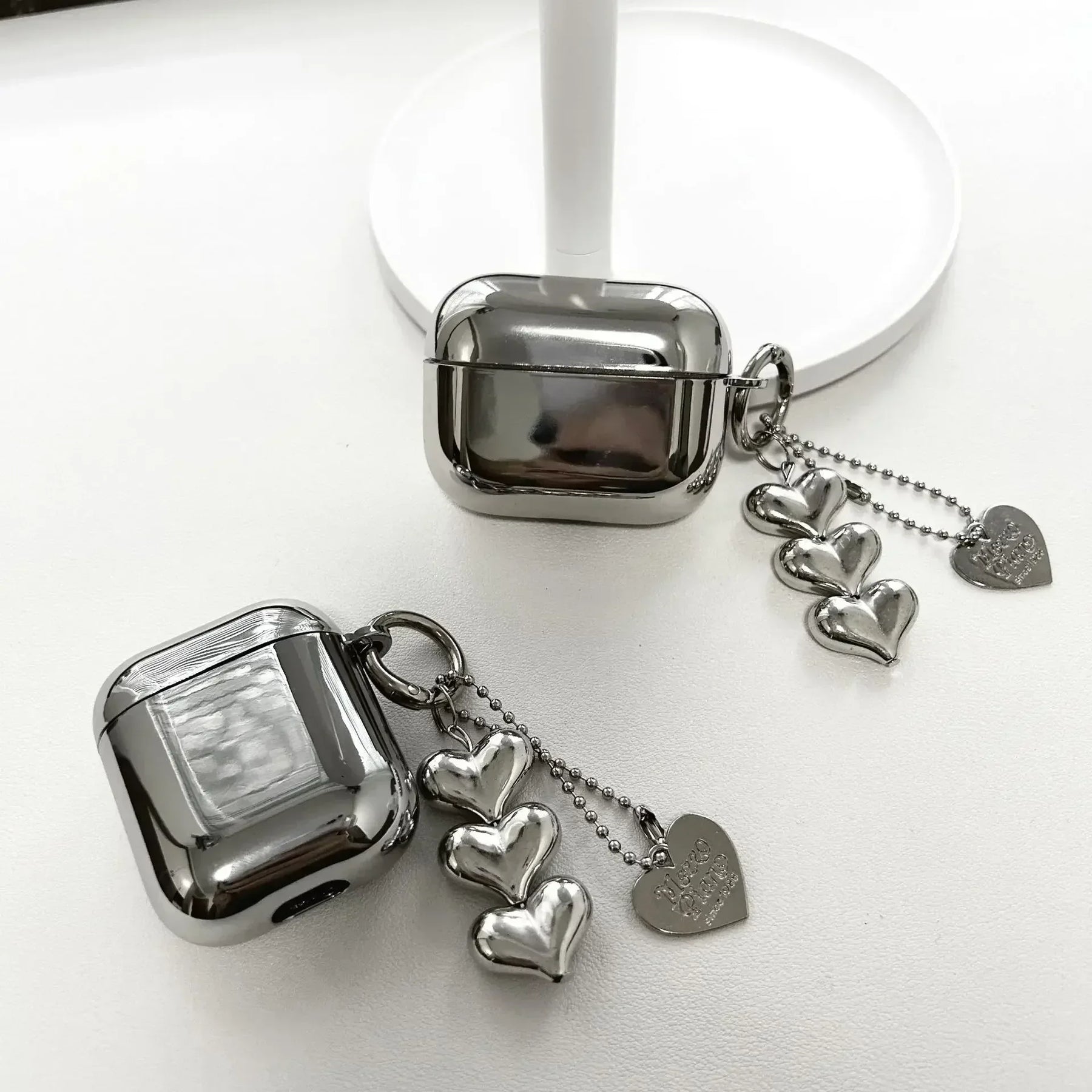 Metallic reflections, bold energy. This electroplated case gives your AirPods a futuristic edge, while the chain-linked heart charm adds a rebellious twist.